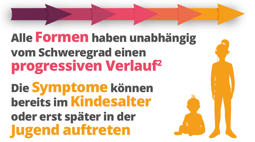 Das wiederum führt zu einer fortschreitenden Zellschädigung. Kinder zeigen erst nur wenige Krankheitsanzeichen, mit dem Fortschreiten der Erkrankung treten dann jedoch immer mehr Symptome auf.1